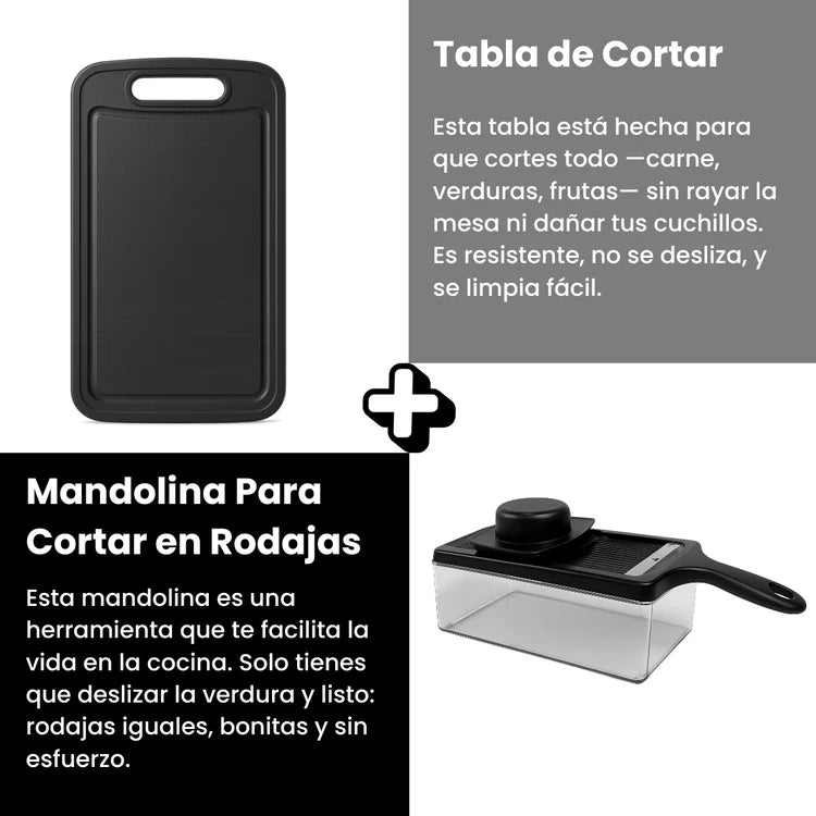 Con tu compra del set CulinaPro™, te regalamos esta tabla resistente y una mandolina ultra práctica para cortar como un chef. Porque un buen cuchillo merece las herramientas que lo acompañen.